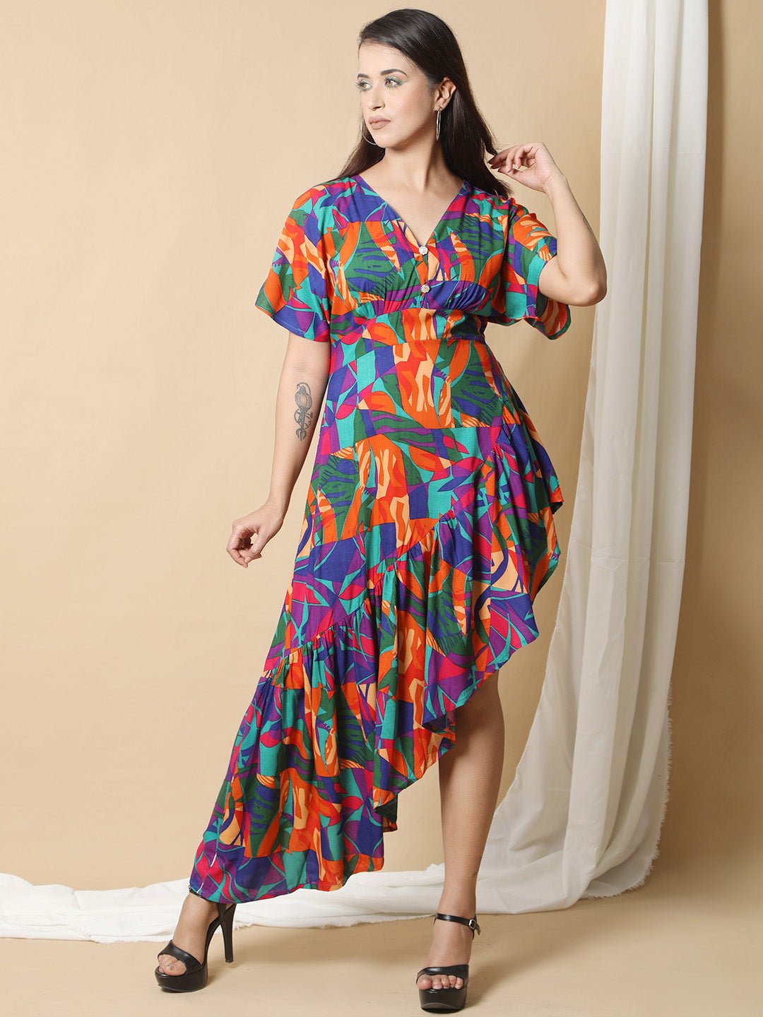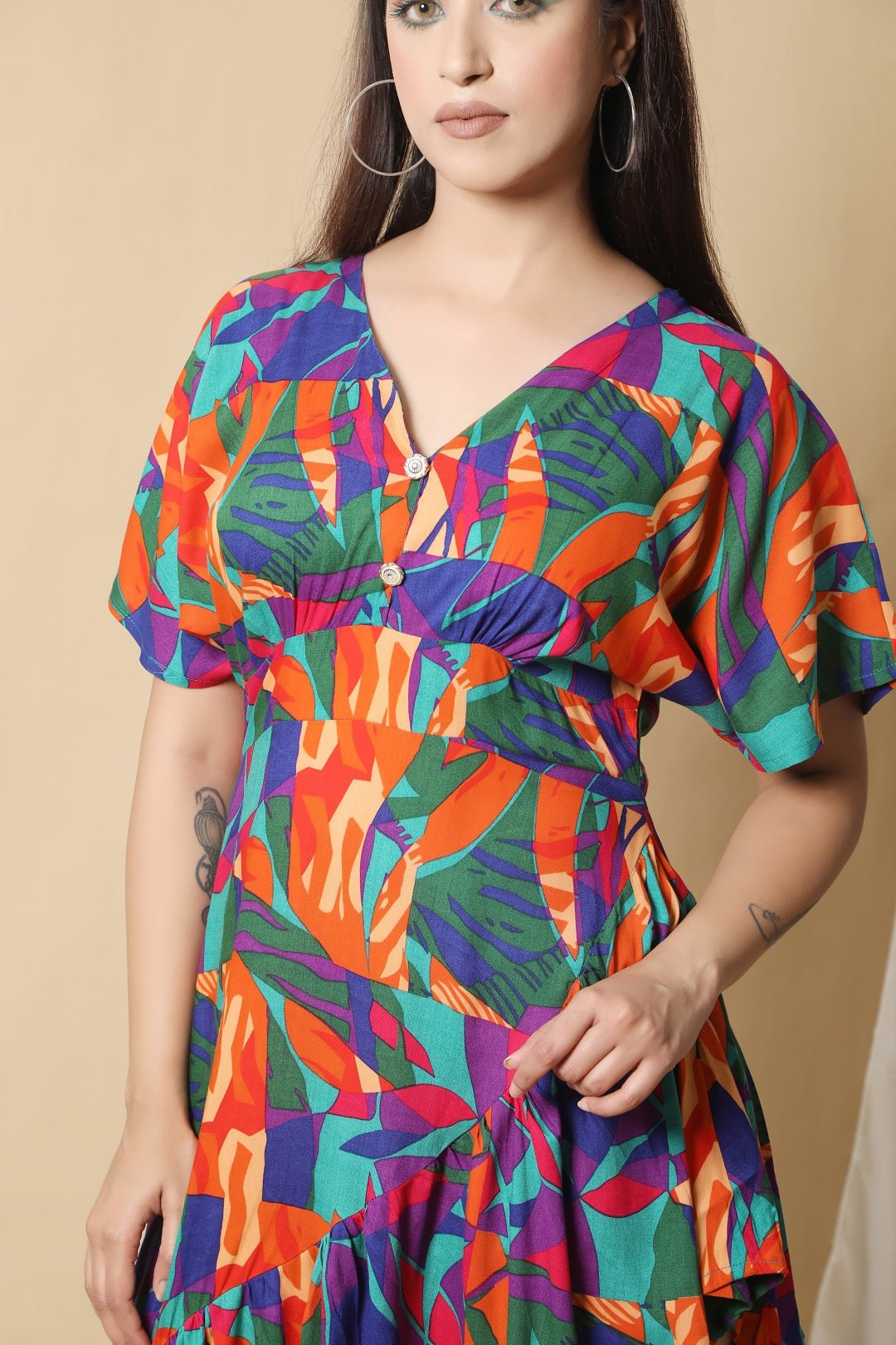 Material composition: Rayon Fit type: Straight / Regular Fit Sleeve type: Half Sleeve Length: Standard Length Neck style: V Neck Style: Western Wear Wash Care: Machine Wash Occasion: Casual / Office Wear
